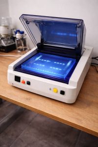 منبع نور (UV / Blue Light): برای تحریک رنگهای فلورسانس مانند اتیدیوم بروماید یا SYBR Safe.